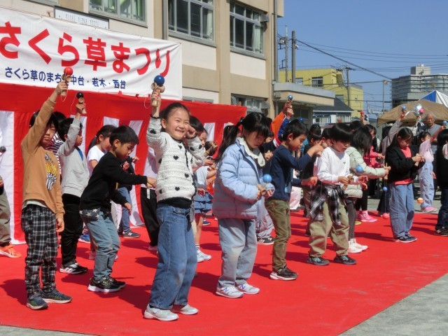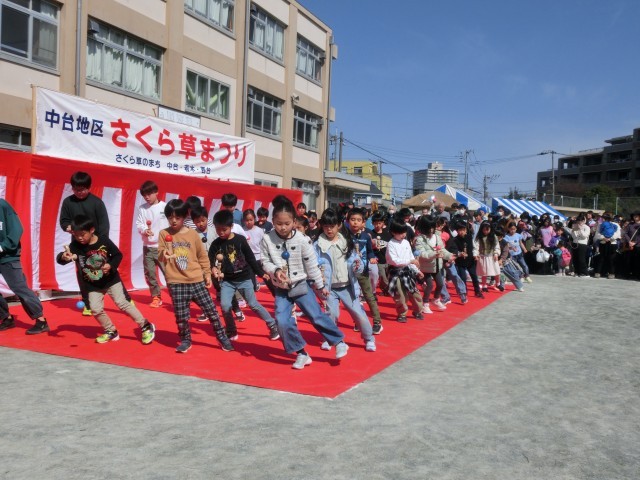 さくら草まつりで有志の子どもたちによるけん玉ダンスを披露しました。