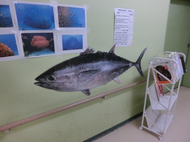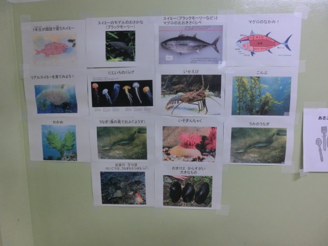 1年生の教室前の廊下には、国語「スイミー」の学習に合わせて、大きなミサイルのようなマグロの写真やカラフルなクラゲの写真など、物語に出てくる海の生き物たちの写真が掲示されていました。
