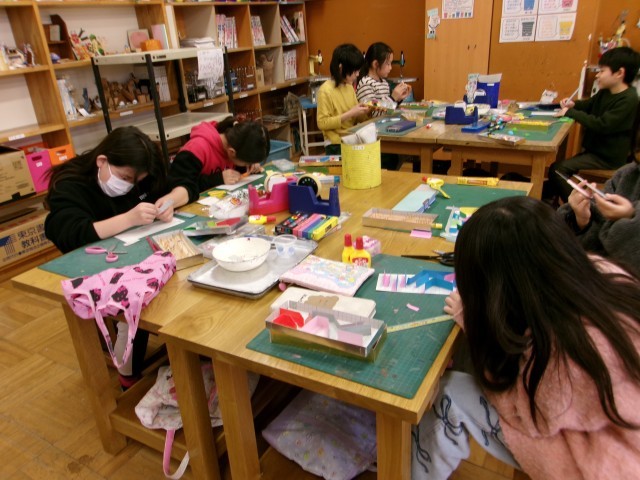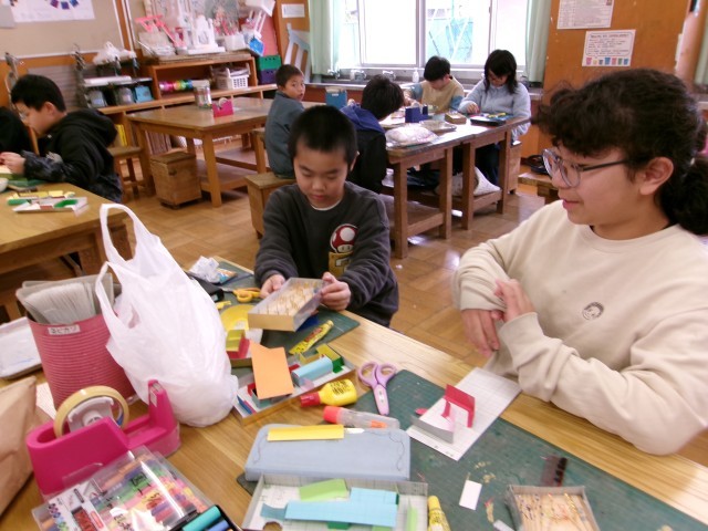 4年生は図工で「ビー玉タワーコリントタワー」という作品を作っています。ビー玉をころがして遊ぶ作品で、木や紙を使っています。今仕上げをしているところで、もうすぐできあがりそうです。個性豊かで楽しい作品になりそうです。来週の平日学校公開で展示されるので是非見てみて下さい。