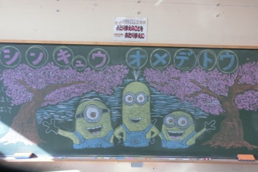 担任からのメッセージなどが添えられた黒板が子どもたちをお出迎えしていました。
