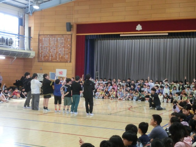 会の中では、5年生作成のメダル渡しや、2・3・4年生からの校歌のプレゼント、代表委員会児童からの若木小クイズ、けん玉ダンスの披露などで1年生の入学を歓迎しました。