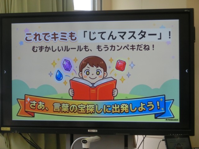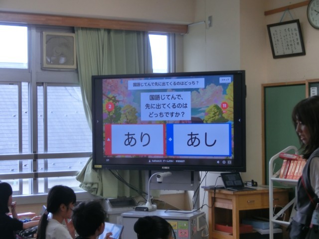 授業の後半には、示された二つの言葉は辞典にどちらが先に書かれているかを当てるというアプリを使ったクイズに取り組み、ゲーム感覚で習熟を図っていきました。