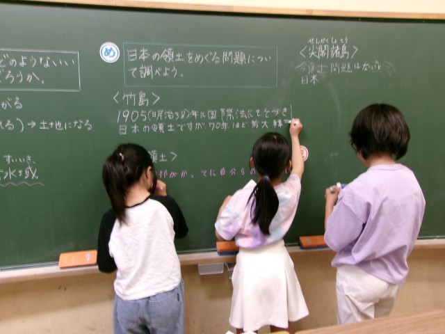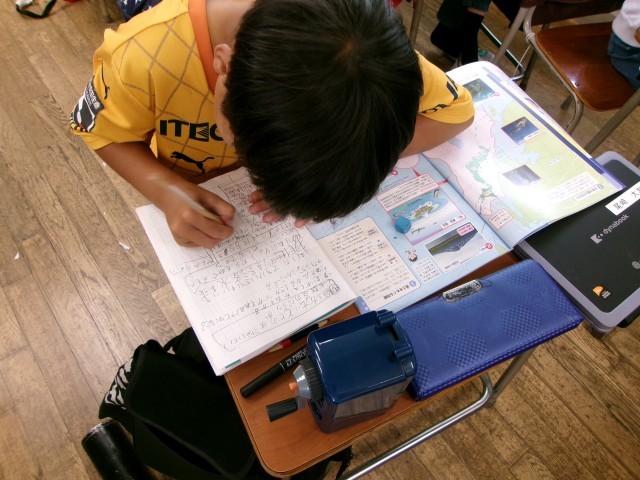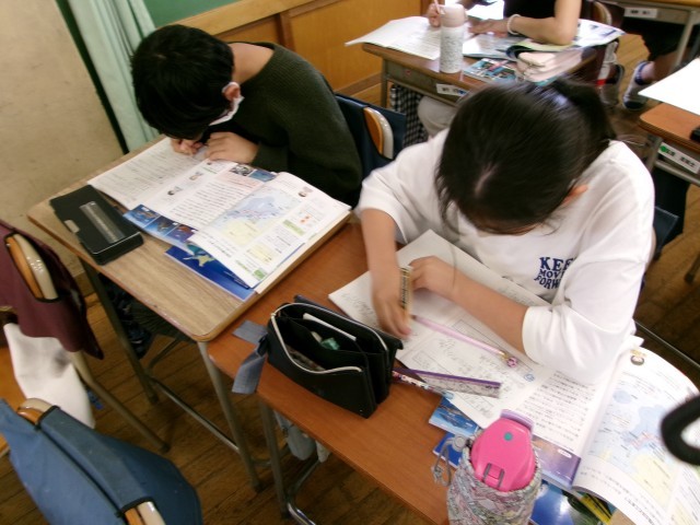 社会の学習では「日本の領土をめぐる問題」について調べました。教科書や資料集を使って情報を集め、ノートにまとめました。集中して取り組む様子が見られ、領土に関する課題を自分だったらどう解決していくかまで考える事ができました。