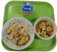 カルシウムビーンズは、戻した高野豆腐とゆで大豆をから揚げにし、ケチャップを入れたタレで和えたものです。子供達が大好きなメニューの上、サンプルケースの見本の盛り付けがやや多かったせいか、多めに盛り付けてしまい、配膳時の後半、盛り付け調整に追われてしまったクラスもありました。