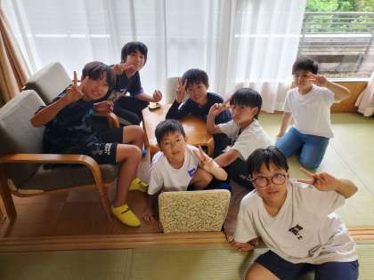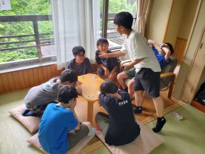 部屋でリラックスモードの子どもたち。人狼ゲームやトランプなど、工夫しながら仲良く過ごしています。