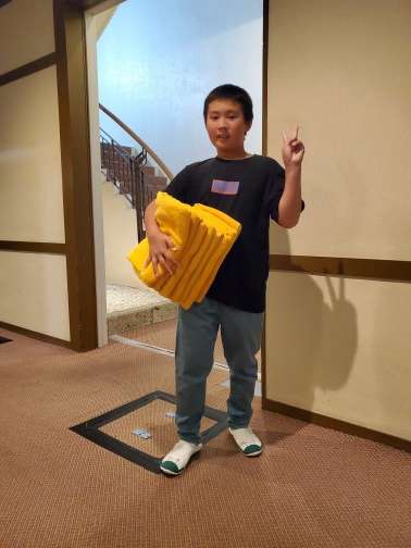 食事も終わり、順番に入浴タイムとなりましたが、部屋に備え付けのバスタオルを忘れてくる班が続出!