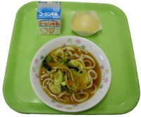 若木小学校では給食の見本を一年生の廊下に面したケースに展示してあります。