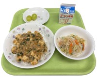 今日は親子丼です。配膳終了~喫食中の時間をねらって、食材ぬいぐるみ持参で巡回しました。