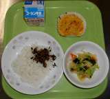 献立 麦ごはん + 昆布ふりかけ 和風卵焼き 野菜のごま酢 延期になっ...
