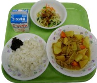 献立 ごはん + のりの佃煮 カレー肉じゃが 野菜のおかか和え 今日は5年生が社会科見学です。 肉じゃがはカレー風味にし、食べやすくしてみました。 野菜が高い中、子どもたちがしっかり食べてくれてよかっ...