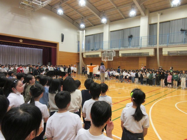 朝の時間は、音楽朝会でした。今回は、6年生を送る会で歌う全校合唱「ビリーブ」のリハーサルです。本番をイメージし、6年生がステージ前に、他の学年はそれをぐるっと囲む形で並びます。美しい歌声が体育館じゅうに響き渡りました。6年生とのお別れが近づいてきた寂しさが、子どもたちの歌声にも表情にも表れていました。