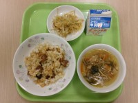 本日の献立  ・牛乳  ・かつお飯(高知県の郷土料理)  ・おひたし  ・さわに...