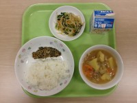 本日の献立  ・牛乳  ・高野豆腐のそぼろ丼  ・野菜のにんにくしょうゆドレッシ...