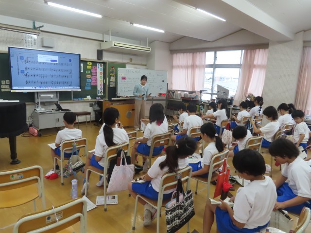 「はずんでいる感じ」や「なめらかな感じ」を音から感じ取り、音の上がり下がりを学んでいました。
