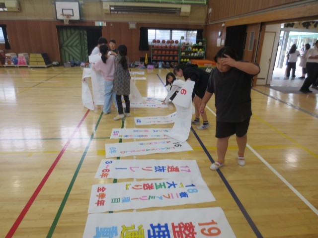 本日6校時、5・6年生が運動会の係打合せを行いました。掲示用プログラム作成係、用具準備係、放送係、着順判定係、出発合図係、採点係などに分かれて行いました。運動会当日のことを考えながら、物を準備したり、動き方の確認や練習をしたりしました。皆、真面目に取り組み、当日に備えることができました。