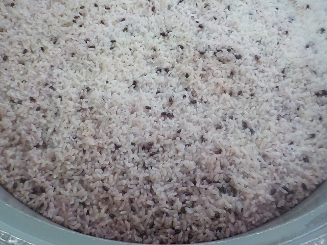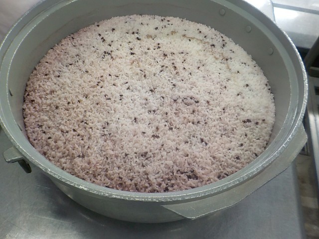 古代米のひとつ、『黒米』を入れてごはんを炊きました。薄い赤い色がつき、赤飯のように