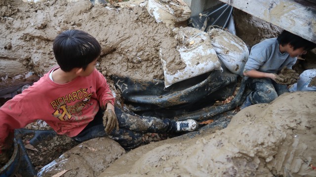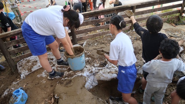 今日は3年生が、泥粘土を自分たちでこねて、作成した土嚢の上に塗る作業を行いました。6年生も手伝いに来てくれました!