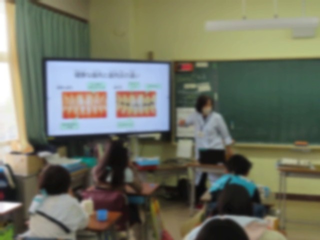 今日は4年生で「歯と口の健康教室」が行われ、歯科校医の先生に来ていただきました。