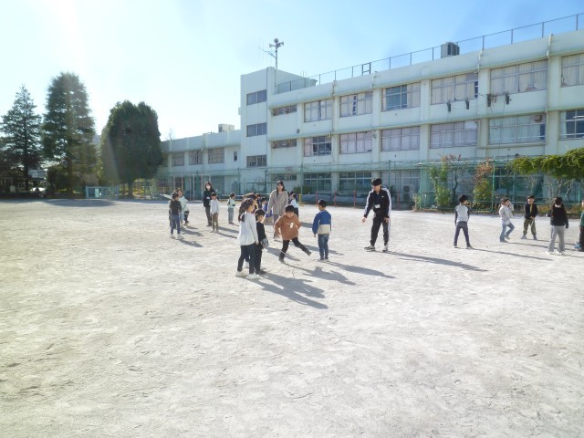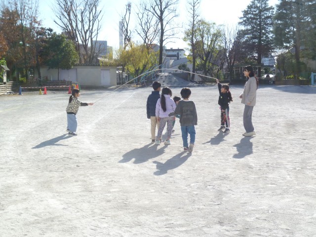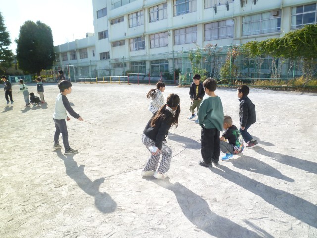歌の練習をした後、校庭で「おおなみ こなみ くるりと まわって ねこの 目」と歌いながら大縄跳びをしました。