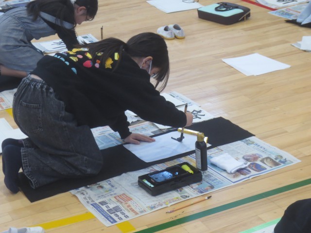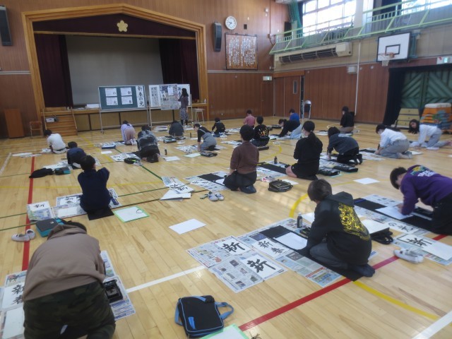 1、2校時、体育館で書き初め「新春の光」の練習をしました。河邊先生に教えていただいたポイントを意識し、集中して書いていました💮