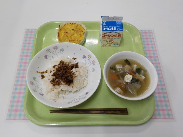 今日のふりかけは、けんちん汁のだしでつかった「けずりぶし」を再利用したものです。