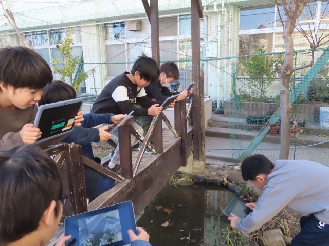 ビオトープや花壇に植えられている花や植物をよく見て、タブレットで記録写真を撮影📷✨