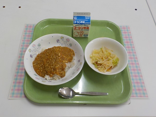 給食の「キーマカレー」は、ひき肉のほかに大豆のみじん切りもいれ、たくさんの栄養をとれるようになっています。