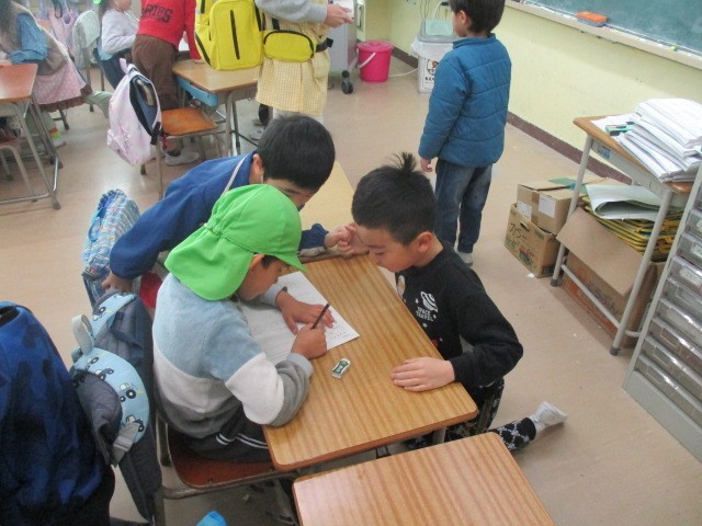 2時間目は、にじいろ保育園の園児たちが1年生の学習に挑戦です。教室で一緒に数の学習をしたり、線のプリントに取り組んだりしました。1年生はそばで優しく教えてあげていました。