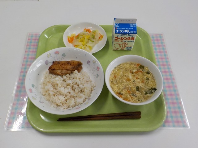 給食の『鶏肉の北京ダック風』は、鶏肉を紹興酒やしょう油、みりん、はちみつ、テンメンジャンでつくったタレに漬け込み、オーブンでカリッと焼きます。