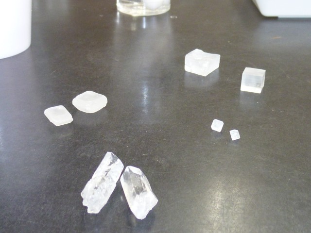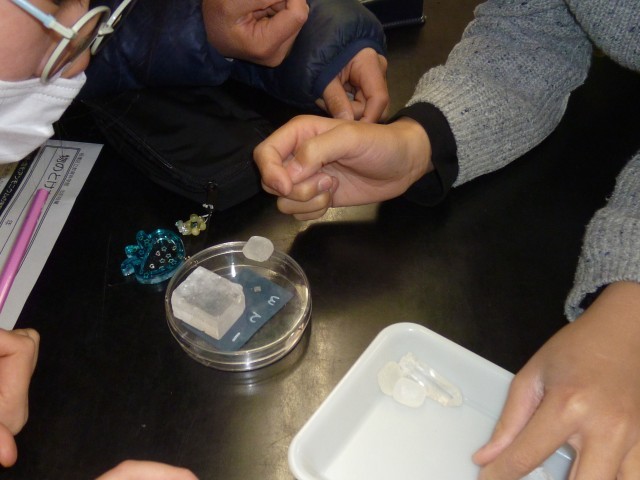 塩化アンモニウムの水溶液を一度温め、その後に冷やすとふわふわと結晶ができていきました。結晶ができる様子を観察し、子供たちは「雪みたい」と喜んでいました。さらにゆっくり冷やしてできた大きな結晶を見せていただくと、子供たちは「すごい!」「こんなに大きくなるんだ!」と大興奮でした✨砂糖、食塩、ミョウバン等物によって結晶の形が違うことも分かりました。