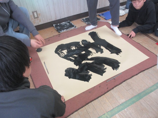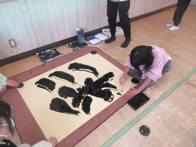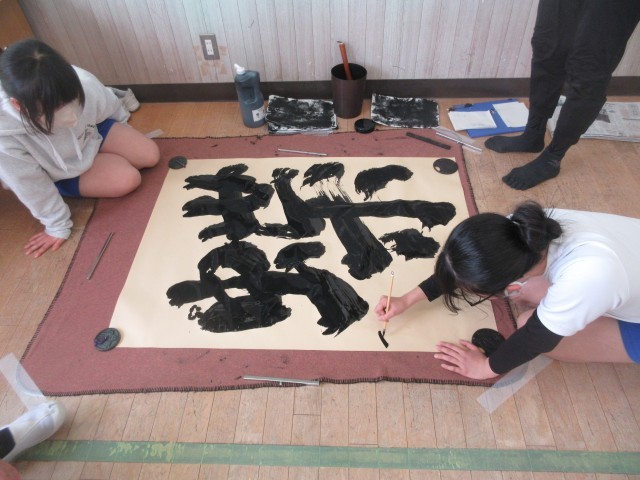 入念に準備体操してから始めました。普段あまり使わない大きな筆を使い、手だけでなく体全体を使って文字を書き上げました。