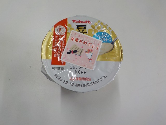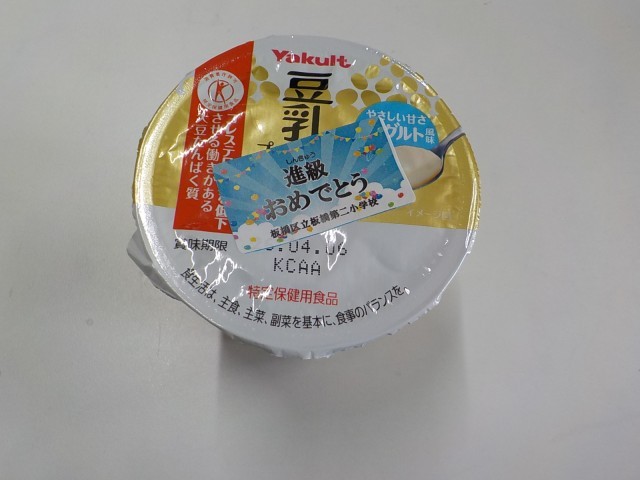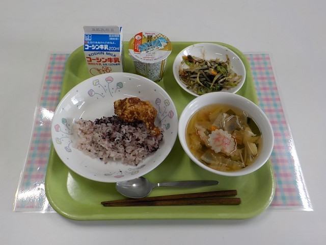黒米(古代米)をつかって、色を出した『古代米赤飯』や【祝】と書いてあるなるとがはいった『すまし汁』、6年生には【卒業おめでとう】1年生から5年生には【進級おめでとう】と書いたシールを貼った『豆乳ヨーグルト』が出ました。