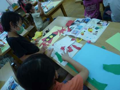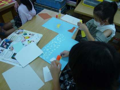 1年生は図工で色画用紙をちぎったものを貼って絵にする活動をしました。