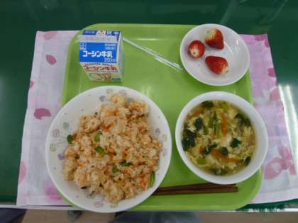 ○春のちらしずし、しめじと卵のすまし汁、いちご、牛乳