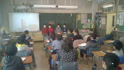 3年生の国語の様子です。興味をもった国について、グループで調べたことを発表していました。