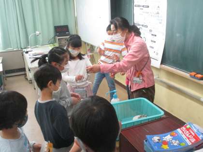 トライアングルやタンバリンなどの楽器を使って練習をしていました。先生の話を聞いて楽しそうに取り組んでいました。