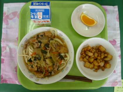 ○かけきつねうどん、カレービーンズ、清美オレンジ、牛乳