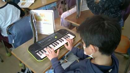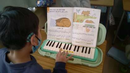 音楽の様子です。新型コロナウイルス感染予防のため、鍵盤ハーモニカは吹かずに指の練習をするのに使用しています。今日はキーボードが登場し、練習の成果を生かして実際に演奏をしていました。