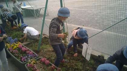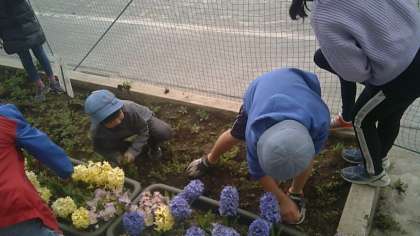 3年生の先週の様子です。綿花を育てていた、学級の花壇の草むしりをして、きれいに整備をしてくれていました。手前のプランターには、子供たちが植えたパンジー、ヒヤシンス、チューリップがきれいに咲いています。