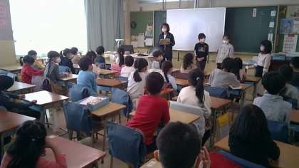 1年生の今朝の様子です。健康観察をしているところです。名前を呼ばれたら、手をしっかりあげて、はっきりと返事をするということが習慣づけられています。