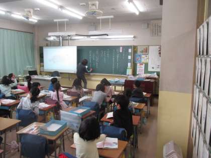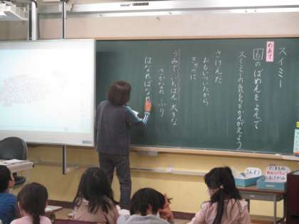スイミーの学習に取り組んでいました。スイミーが仲間を集めて大きな魚を作る場面のスイミーの気持ちを友達と相談しながら考えていました。