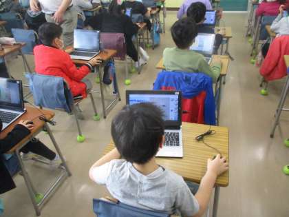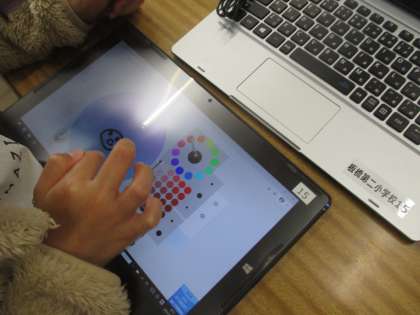 プログラミングソフトを使って、自分が描いた絵を動かす学習に取り組みました。どのようにプログラムを組めば描いた絵が思い通りに動くか考え、集中して取り組んでいました。