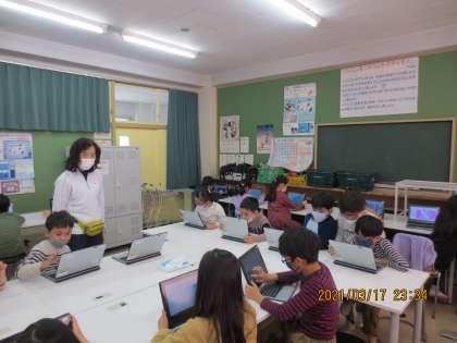 2年生の図工の様子です。パソコンでイラストや画像を取り込んだり、指先を使って絵を描いたりする学習をしました。