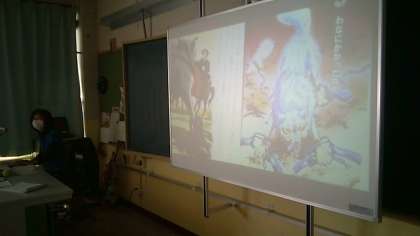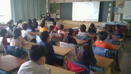 1年生の国語の様子です。先生が拡大投影機を使って読み聞かせをしてくれていました。皆、興味津々で聞いています。