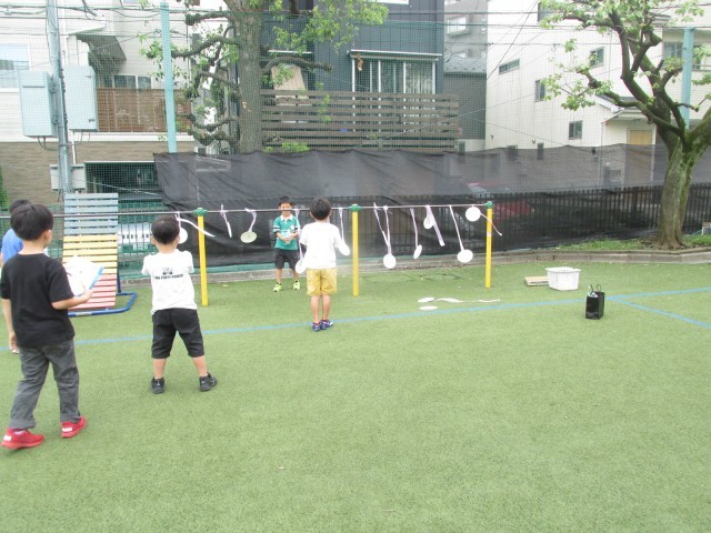 1学期に体験した遊びから、さらに遊びたい水遊びを自分で選び、学級をまたいで同じ遊びを選んだ友達とグループを作りました。「水鉄砲で鬼ごっこをしたい!」「的を作って的当てが楽しそう!」とグループごとに相談して協力しながら、必要な物や遊び方を考えました。暑さが収まらず、外に出ることができない日が続きましたが、念願の水遊びを決行することができ、とても楽しそうでした。