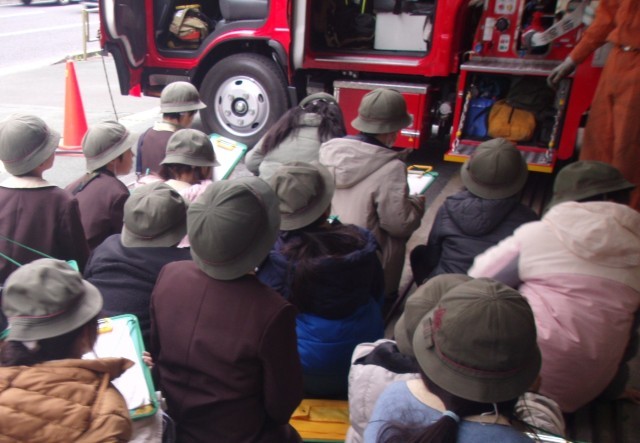 消防署の方の説明を聴いたり、消防車の中を見たりしながら、学習を深めることができました。