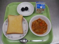 本日の給食 牛乳 ごはん あんかけ卵焼き みそ汁 清見オレンジ