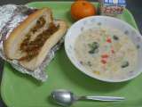 本日の給食 ・牛乳 ・きんぴらドッグ ・白いんげん豆のクリームスープ ・みかん...