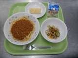 本日の給食 牛乳 スパゲッティミートソース りっちゃんの元気サラダ りんご