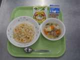 本日の給食 牛乳 スパゲティあけぼのソース 海藻サラダ お豆のケーキ
